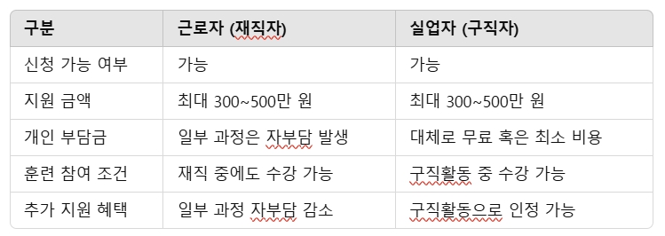 국민내일배움카드는 근로자와 실업자 모두 이용할 수 있지만, 지원 조건과 혜택에 차이가 있습니다.
