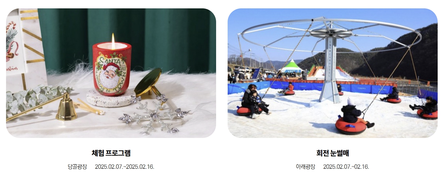 내용: 축제 기간 동안 다양한 동계 스포츠 체험 프로그램이 마련되어 있습니다. 주요 프로그램으로는 눈썰매, 대형 눈 미끄럼틀, 눈 미로 탐방 등이 있습니다.