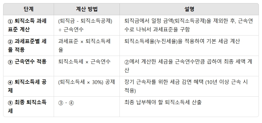 세율은 구간별로 적용되며, 10년 이상 근속 시 세금 부담이 줄어든다.