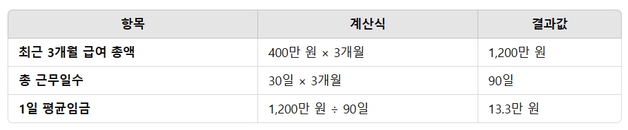 1일 평균임금 = 최근 3개월 급여 총액 ÷ 3개월 총 근무일수